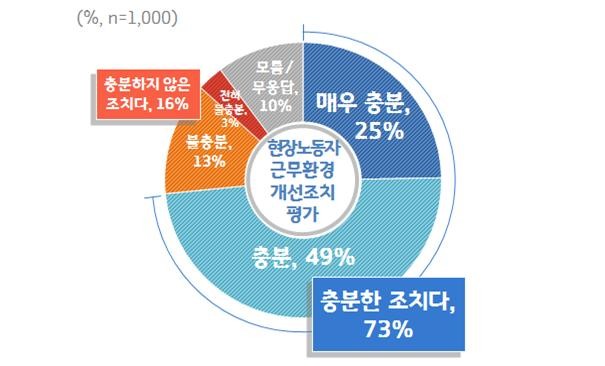 경기도가 만19세 이상 도민 1000명을 대상으로 실시한 ‘도정현안 여론조사’에 따르면 응답자의 73%가 이번 근무환경 개선사업에 대해 ‘충분한 조치’라고 생각하는 것으로 나타났다. ‘충분하지 않다’는 의견은 16%에 불과했다.