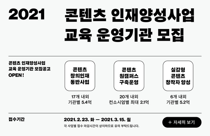 2021년에는 콘텐츠업계와 구직자 간 일자리 미스매칭을 해소하기 위해 업계 수요맞춤형 사업을 구성했으며, 신기술 변화에 발맞춰 실감형, 인공지능 콘텐츠 전문인력 양성에 힘쓸 예정이다. 이에 ▲콘텐츠 창의인재동반사업 ▲콘텐츠 원캠퍼스 구축운영 사업 ▲실감형 콘텐츠 창작자 양성사업을 운영할 총 43개의 기관을 오는 15일까지 모집한다.