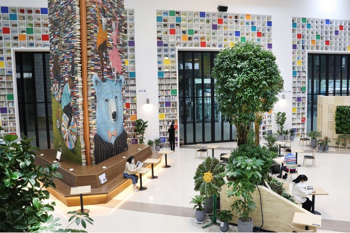 ㈜신세계프라퍼티에서 기증받은 9m 높이의 초대형 북트리 ‘원더랜드’도 만날 수 있다. 세계적인 북 아트 예술 작가인 ‘마이크 스틸키’(Mike Stilkey)의 작품으로, 버려진 책 1만4000권의 책을 쌓아 만든 북트리에 익살스러운 그림이 그려져 있다.