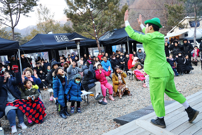 | ▲쌍용자동차가 지난 18일(토) 고객 전용 오토캠핑장에서 ‘푸른밤 별빛 캠프’를 타이틀로 2020년 첫 쌍용패밀리데이(SFD)를 개최했다. 코미디의 전설 찰리 채플린의 무성영화를 모티브로 한 코믹 퍼포먼스(마임쇼)에 관객들이 참여해 즐거운 시간을 보내고 있다.(쌍용자동차 제공) |