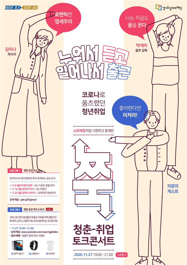 이번 2020 청춘취업 토크콘서트는 코로나19로 인한 고용충격으로 취업 등에 어려움을 겪고 있는 청년들에게 새로운 활력을 불어넣고자 경기도와 경기도일자리재단이 마련한 온라인 비대면 행사다.