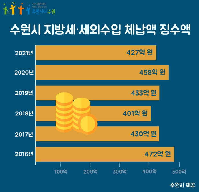 수원시는 2016년 체납액 472억원을 징수한 것을 시작으로 2017년 430억원, 2018년 401억원, 2019년 433억원, 2020년 457억원을 징수했다.