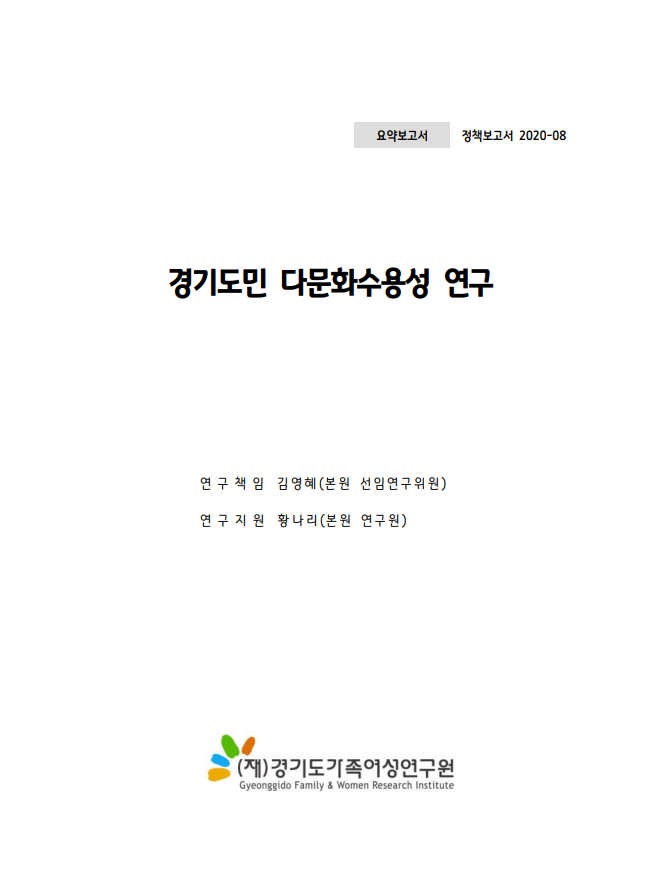 경기도가족여성연구원은 다문화사회로의 변화와 서로 상이한 인종적, 문화적 배경을 지닌 집단을 사회구성원으로 허용해 받아들이는 정도를 살펴보기 위해 '경기도민 다문화수용성 연구' 제목의 정책보고서를 최근 발간했다고 6일 밝혔다.