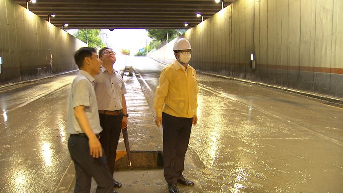 | ▲염태영 시장(오른쪽)이 화산지하차도 복구작업을 점검하고 있다.(수원시 제공) |