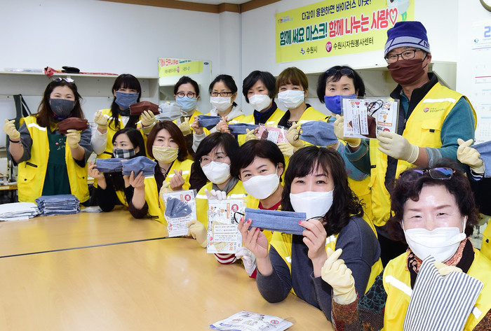 | ▲천마스크를 만들고 있는 자원봉사자들.(수원시 제공) |