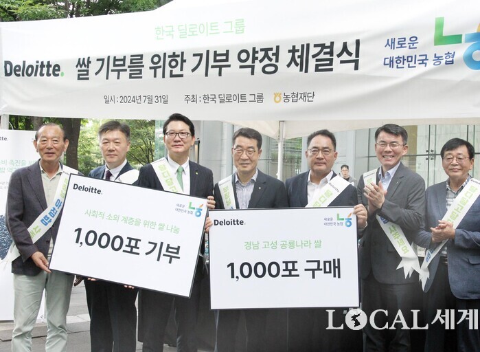 ▲31일 오전 서울 영등포구 IFC 광장에서 열린 농협-한국 딜로이트 그룹 쌀 기부를 위한 기부 약정 체결식에서 정점식 국민의힘 정책위원회 의장, 박범수 농림축산식품부 차관, 홍종성 한국 딜로이트그룹 총괄대표 등 참석자들이 기념 촬영하고 있다 |