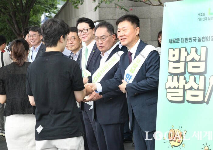 ▲농협은 한국 딜로이트 그룹과 함께 31일 여의도 국제금융센터 광장에서 출근하는 직장인들을 대상으로 쌀 소비 활성화를 위한 ‘아침밥 먹기 캠페인’을 개최했다. 박범수 농림축산식품부 차관(오른쪽부터), 지준섭 농협중앙회 부회장과 홍종성 한국 딜로이트 그룹 총괄대표가 캠페인 활동으로 농협쌀밥 및 홍보물을 배포하고 있다. |