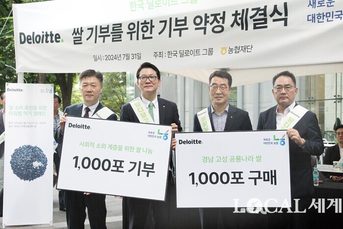▲홍종성 한국 딜로이트 그룹 총괄 대표와 문석근농협재단 사무총장이 31일 오전 서울 영등포구 IFC 광장에서 범국민 쌀 소비 촉진운동의 일환으로 열린 농협-한국 딜로이트 그룹 아침밥 먹기 캠페인에서 쌀 구입 및 기부 양해각서 체결을 마친 후 박범수농림축산식품부 차관, 지준섭 농협중앙회 부회장과 참석자들이 기념촬영을 하고 있다. |
