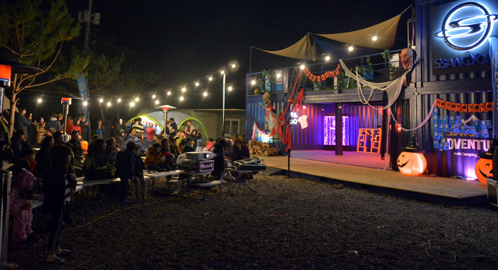 ▲캠핑빌리지의 랜드마크인 청춘라운지 앞에 참가자들이 함께 모여 무서운영화관을 관람하고 있다. |