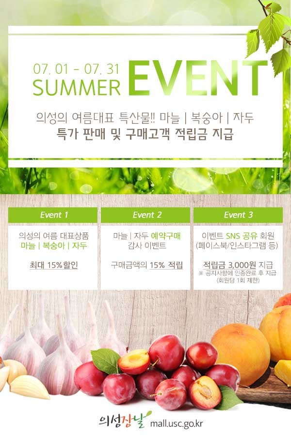 [로컬세계 박상진 기자]경북 의성군 농특산물 쇼핑몰인 ‘의성장날’(http://mall.usc.go.kr)에서는 의성군 대표 여름 농산물인 마늘, 자두, 복숭아의 출하기를 맞아 특별 이벤트를 실시한다고 3일 밝혔다.