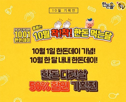 | ▲한돈 공식 온라인 쇼핑몰인 한돈몰에서는 10월 한 달 동안 ‘올해는 10월 착! 착! 한돈 먹는달’’이라는 주제로 ‘한돈 다릿살 50% 할인 기획전’을 진행한다. |