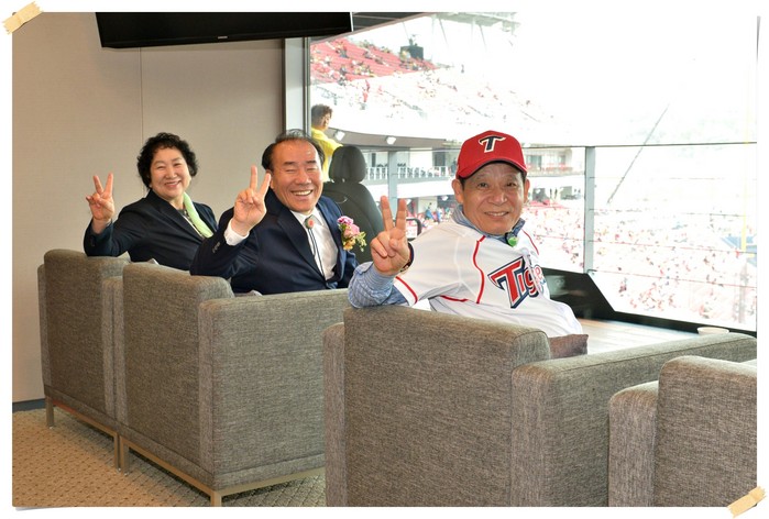 ▲지난 28일 광주-기아 챔피언스 필드에서 윤장현 광주시장과 장휘국 광주시교육감 부부가(사진 오른쪽부터) KIA 타이거즈와 LG 트윈스의 개막전을 관람하다 기념촬영을 하고 있다. |