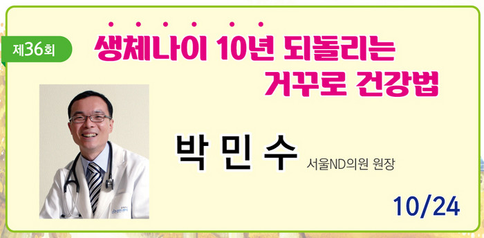 이번 강좌는 박민수 서울ND의원 원장이 ‘생체나이 10년 되돌리는 거꾸로 건강법’을 주제로 강연한다.