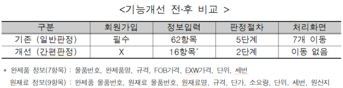 개선사항으로는 정보입력 항목을 기존의 62개에서 16개로 축소하고 판정절차도 5단계에서 2단계로 간소화했으며 7개로 이동된 판정 화면이 한 화면에서의 처리가 가능하게 됐다.
