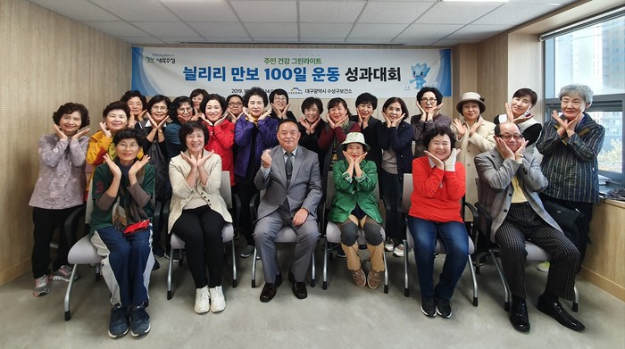 | ▲2019년 늴리리 만보 100일 운동 성과대회 기념 촬영 사진.(수성구 제공) |