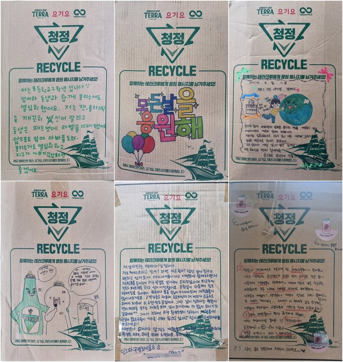 | ▲청정라거-테라의 리사이클캠페인 참여자들의 응원메시지. [하이트진로 제공] |