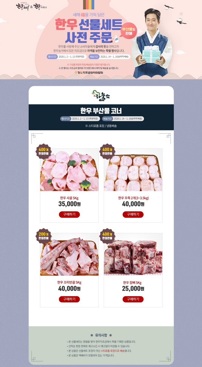 사골 및 잡뼈와 우족은 400개, 꼬리 반골은 200개가 준비되어 있으며 선물 포장이 아닌 일반 포장으로 판매한다. 구매 방법은 한우자조금관리위원회에서 운영하는 온라인 사이트 한우유명한곳에서 확인할 수 있다.