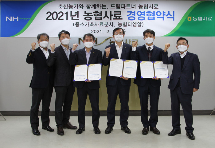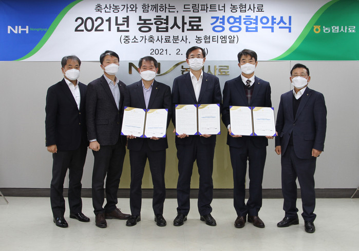 | ▲농협사료는 지난 8일 ′축산농가와 함께 드림파트너 농협사료′가 되기 위한 경영협약식을 개최했다.(왼쪽 부터 이동환 감사실장, 유기엽 전무이사, 김충렬 중소가축분사장, 안병우 대표이사, 권영철 농협티엠알대표, 정상태 전무이사)/농협사료 제공 |