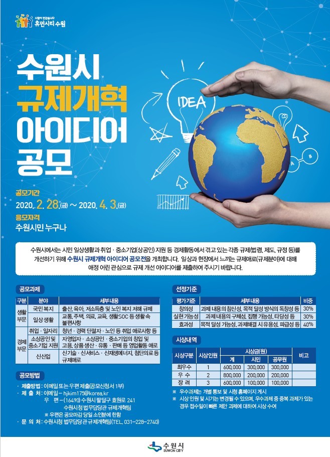 수원시는 오는 28일부터 4월 3일까지 ‘2020 수원시 규제개혁 아이디어 공모’를 진행한다고 26일 밝혔다.