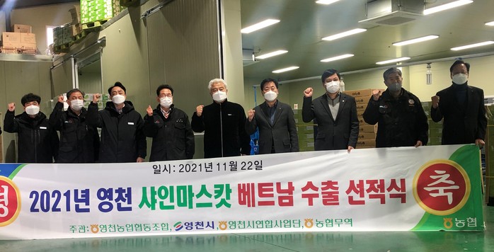 농협(회장 이성희) 경제지주 계열사인 NH농협무역은 지난 22일 경북 영천농협(조합장 성영근)에서 생산된 2021년산 샤인머스캣을 베트남으로 수출하기 위한 선적식을 실시했다.