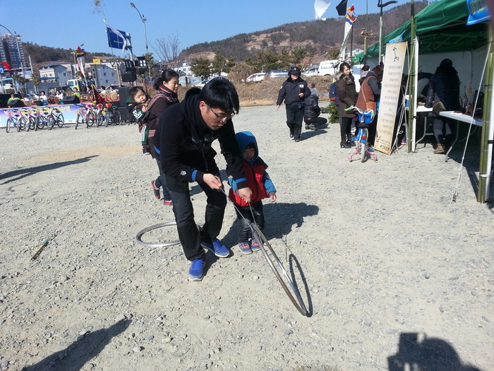 ▲지난해 개최된 2014 여수 정월대보름 행사장을 찾은 가족들이 굴렁쇠 놀이를 즐기고 있다. |