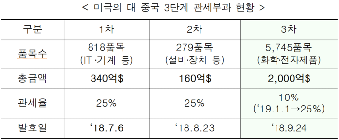 | ▲미국의 대 중국 3단계 관세부과 현황.(관세청 제공) |