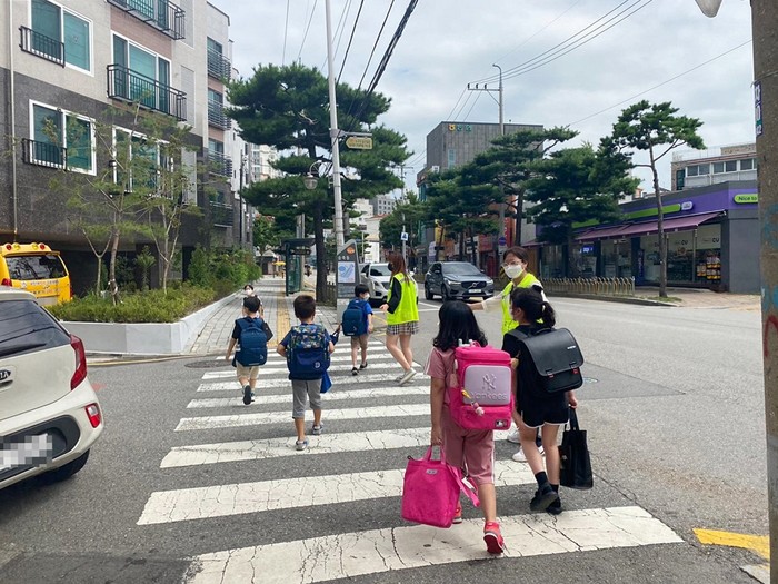 보행안전지도사는 초등학생들의 등하굣길에 함께하며 집이 같은 방향인 아이들을 데려다준다. 아이들과 걸으며 교통안전교육도 한다.