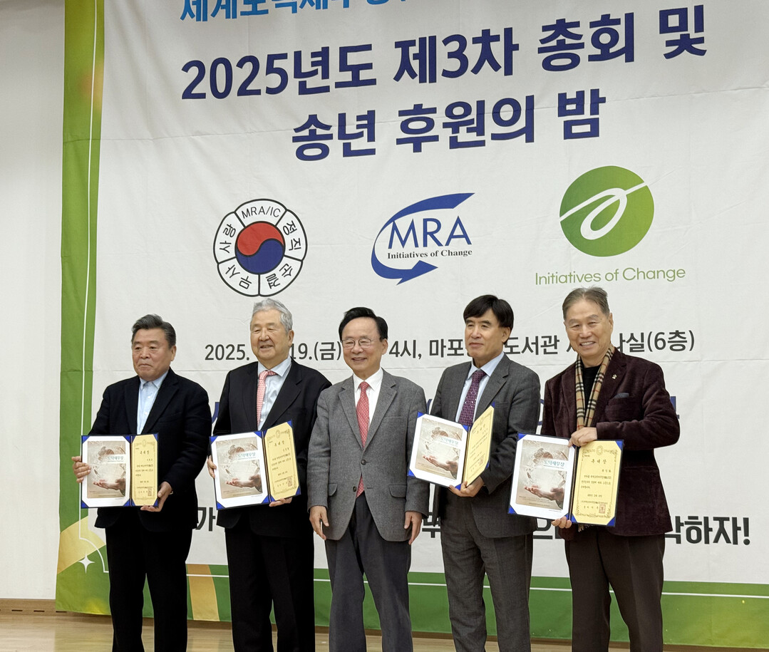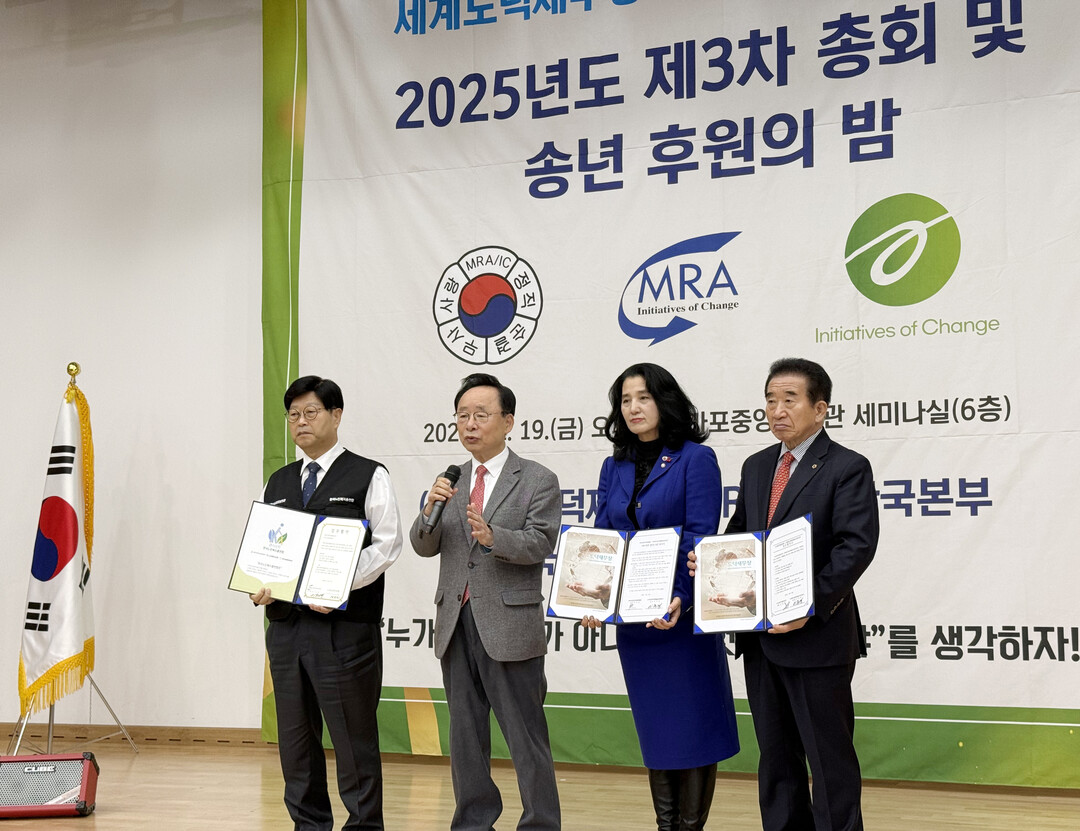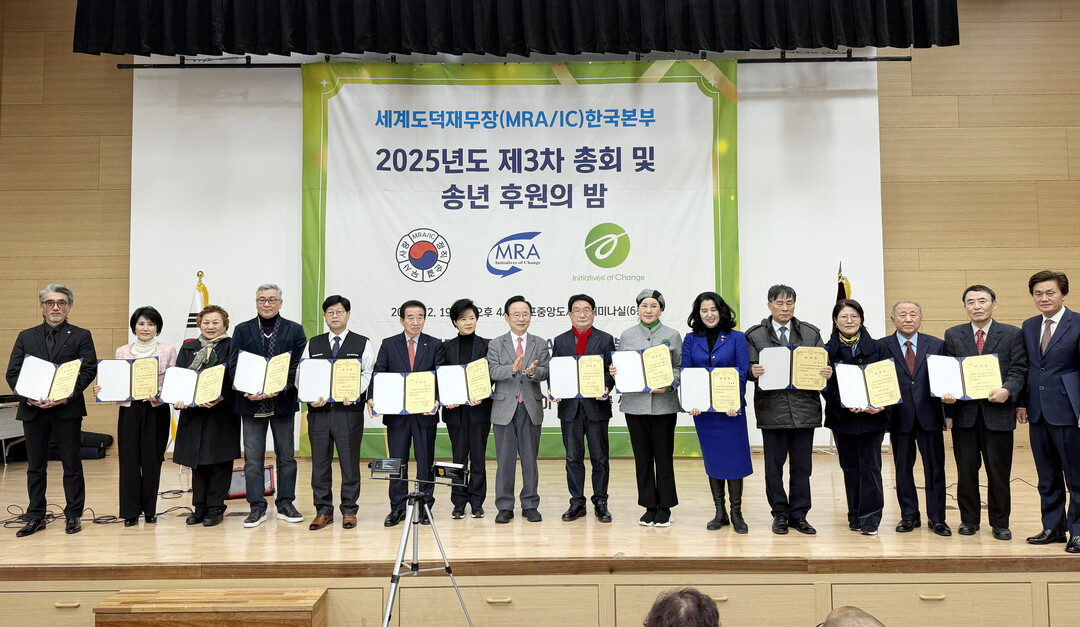 세계도덕재무장(MRA/IC)한국본부(총재 이주영)는 12월 19일 마포중앙도서관 강당에서 200여명의 회원과 후원자들이 참여한 가운데 송년총회와 후원의 밤 행사를 성황리에 개최했다. 지원근 연세대행정대학원총동창회장 부총재 추대