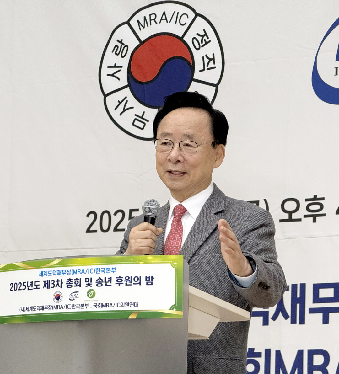 세계도덕재무장(MRA/IC)한국본부(총재 이주영)는 12월 19일 마포중앙도서관 강당에서 200여명의 회원과 후원자들이 참여한 가운데 송년총회와 후원의 밤 행사를 성황리에 개최했다.이주영 총재가 개회사를 하고 있다