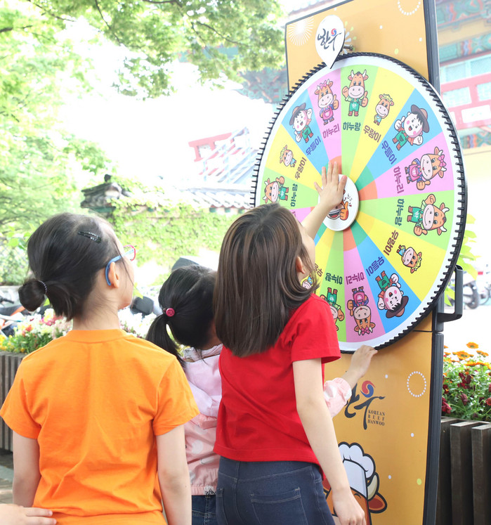 | ▲'도심 속 한우축제에서 룰렛 이벤트 즐기자' 4일 서울 어린이대공원에서 열린 한우자조금의 ‘도심에서 만나는 한우축제’에서 어린이들이 한우 캐릭터를 활용한 룰렛 이벤트를 체험하고 있다. |