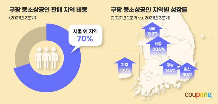 쿠팡에 따르면 올해 2분기 쿠팡과 거래하는 중소상공인 중 서울 소재의 중소상공인은 전년동기 대비 129.6% 성장했다. 반면, 일부 지역의 경우 인구와 상권이 밀집되어 있는 서울보다 더 가파르게 성장세를 보였다. 2분기 쿠팡과 함께하는 울산 소재 중소상공인은 157.6%, 경상남도 소재 중소상공인은 145.7%, 제주도 소재 중소상공인은 130.1% 성장하며 서울의 성장세를 뛰어넘었다. 특히 세종시 소재 중소상공인의 경우 올해 2분기 성장률 206.3%를 기록하며 전국에서 가장 큰 폭으로 성장했다.