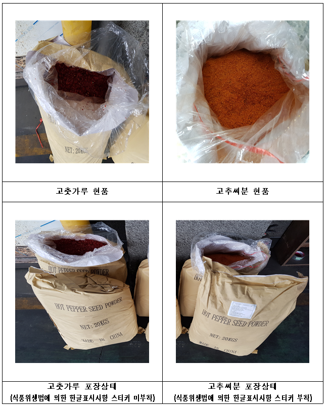 이외에도 안모씨(남, 40세)는 중국산 고추씨분(고추씨를 빻은 가루)을 수입하면서, 고추씨분 포대 사이에 중국산 고춧가루 포대 5.4톤(시가 6000만원 상당)을 몰래 은닉해 밀수입했다.