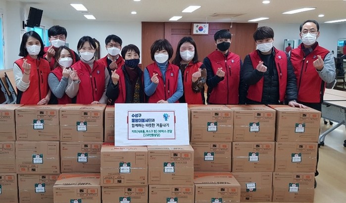 김대권 수성구청장은 “코로나19로 몸도 마음도 추운 겨울이지만 공무원봉사단의 지역주민을 위한 따뜻한 마음이 더불어 행복한 공동체를 만드는데 도움이 되길 바란다”고 말했다.