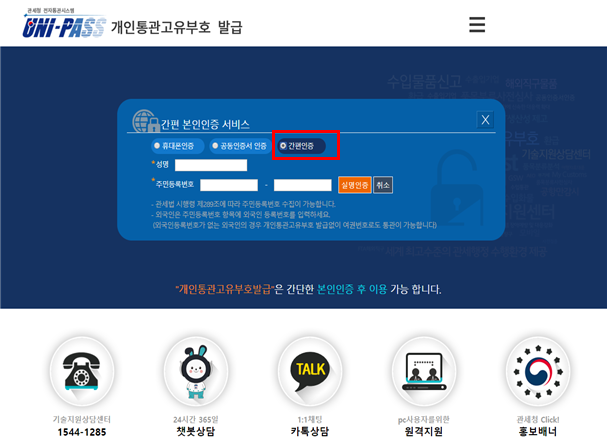 다만, 간편인증으로 개인통관고유부호를 발급받거나 조회하고자 하는 경우에는 미리 스마트폰에 해당 간편인증 앱을 설치해 인증서를 발급받아야 이용가능하다.