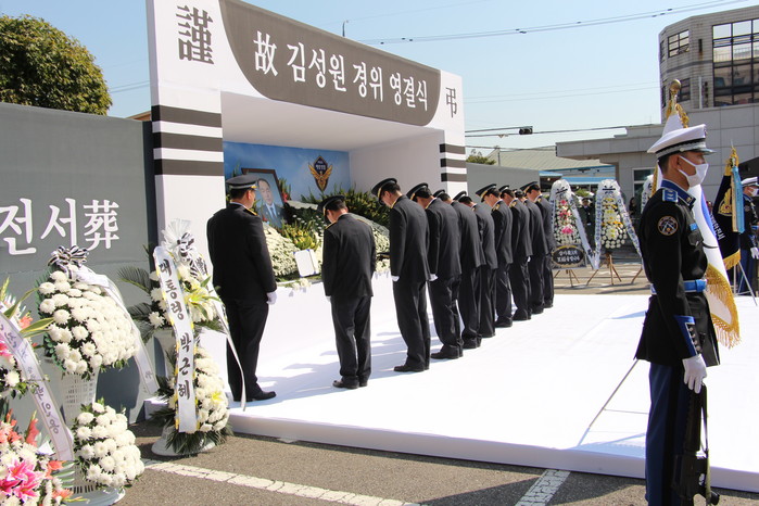 이날 영결식은 김 경위 유가족을 비롯해 홍익태 해양경비안전본부장, 송나택 서해해경본부장, 전현명 군산해경서장 등 전국에서 모인 해양경찰 300여명과 문동신 군산시장을 포함한 각급 기관단체장 등 총 400여명이 참석해 1시간 동안 진행됐다.
