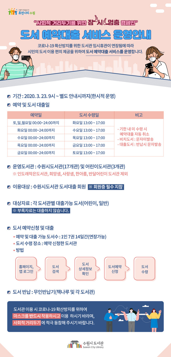 수원시도서관 관계자는 “도서예약대출서비스로 ‘사회적 거리두기’를 지키면서 시민들의 독서 갈증도 어느 정도 해소할 수 있을 것”이라며 “도서관을 방문할 때 마스크를 꼭 착용해주시길 바란다”고 당부했다.