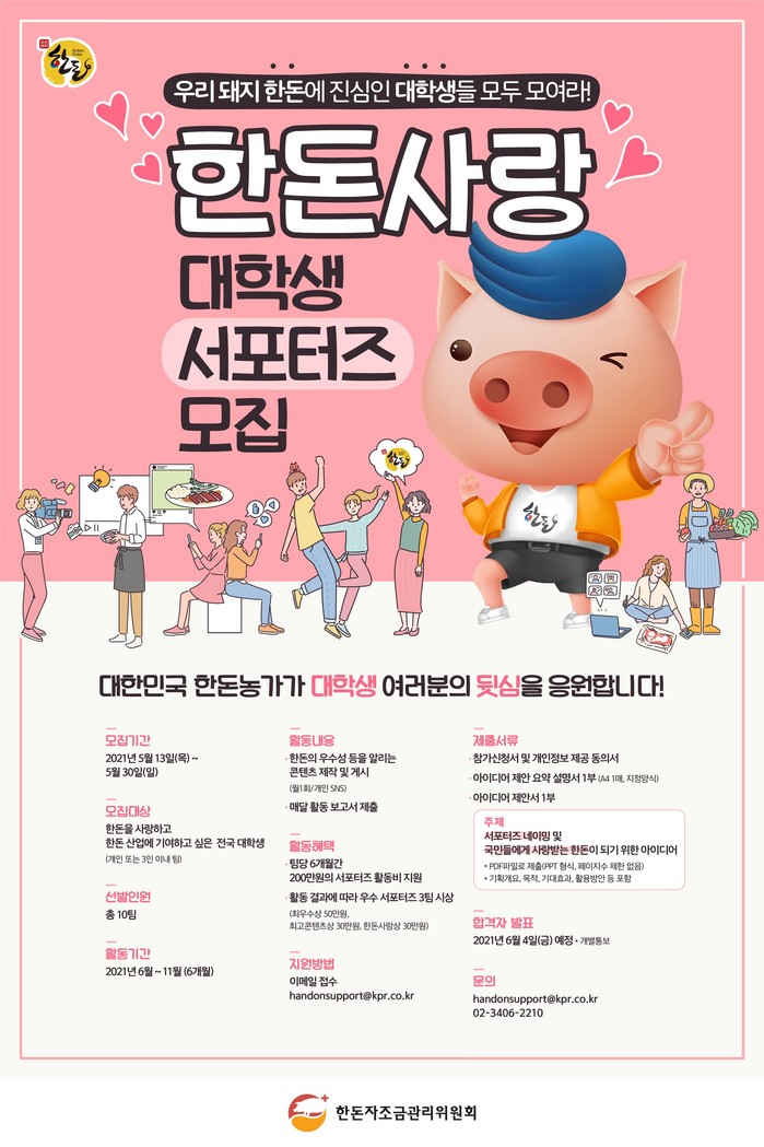 한돈자조금관리위원회(이하 한돈자조금)는 참신한 아이디어로 한돈의 우수성을 알릴 ’한돈사랑 대학생 서포터즈 1기‘를 모집한다고 13일 밝혔다.