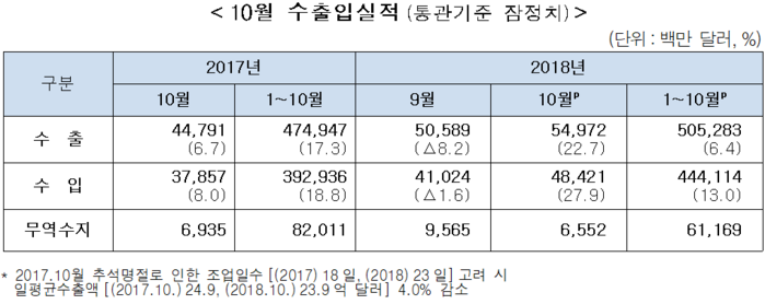 10월 월간 수출액은 549억7000만 달러, 수입은 484억2000만 달러로 1년 전 같은 기간보다 각각 22.7%, 27.9%로 모두 올랐다.