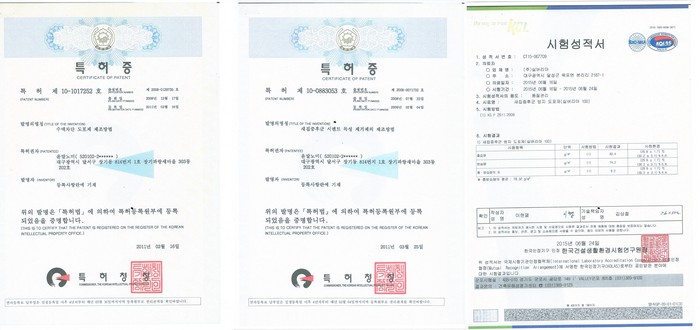 | ▲실버리아 100에 사용된 특허기술과 한국건설생활환경 시험성적서. |