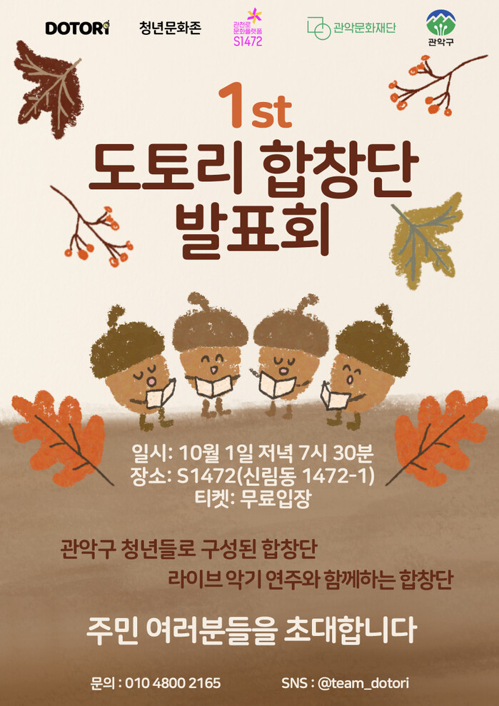 오는 10월 1일 오후 7시 30분, 관악구 복합문화공간 문화플랫폼S1472 공연 무대에서는 ‘관악 청년 문화존’ 사업의 두 번째 성과발표회로 ‘도토리’ 공간 프로그램 참가자들의 ‘도토리 합창단’ 첫 발표회를 연다.