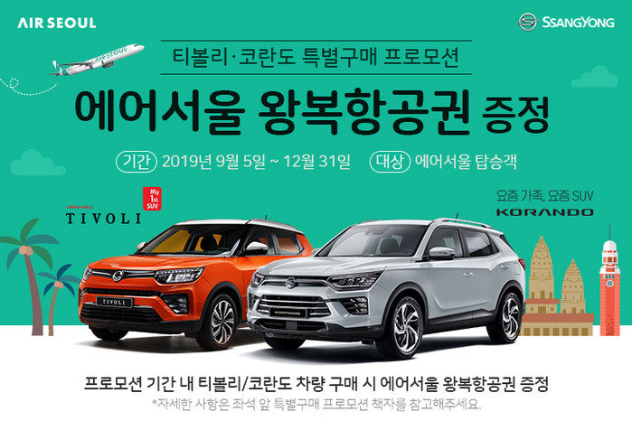 쌍용차는 지난 6월과 8월 각각 베리 뉴 티볼리와 코란도 가솔린 모델을 출시했다. 젊고 스타일리시한 디자인의 두 모델과 ‘젊은 항공사’ 에어서울의 활기 넘치는 협력을 통해 추석과 10월 황금연휴, 연말성수기까지 이어지는 가을·겨울 여행시즌 신차도 구매하고 기분 좋은 여행까지 다녀 올 수 있는 특별한 혜택을 드릴 수 있게 되었다고 쌍용차 관계자는 설명했다.