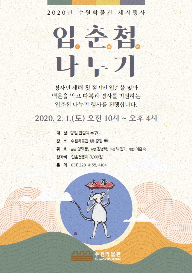 김시헌 수원박물관장은 “경자년 새해 첫 절기인 입춘을 맞아 액운을 막고, 가정의 안녕을 기원하는 입춘첩 나누기 행사를 마련했다”면서 “시민 여러분의 많은 관심과 참여를 부탁드린다”고 말했다.
