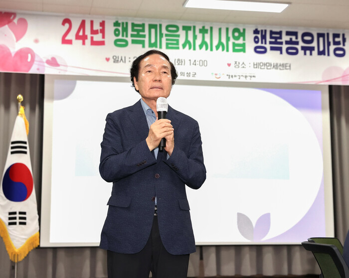 ▲ 김주수 군수가 지난 9일 열린 '2024년 행복마을자치사업 행복공유마당'에서 인사말을 하고 있다. 의성군 제공 |