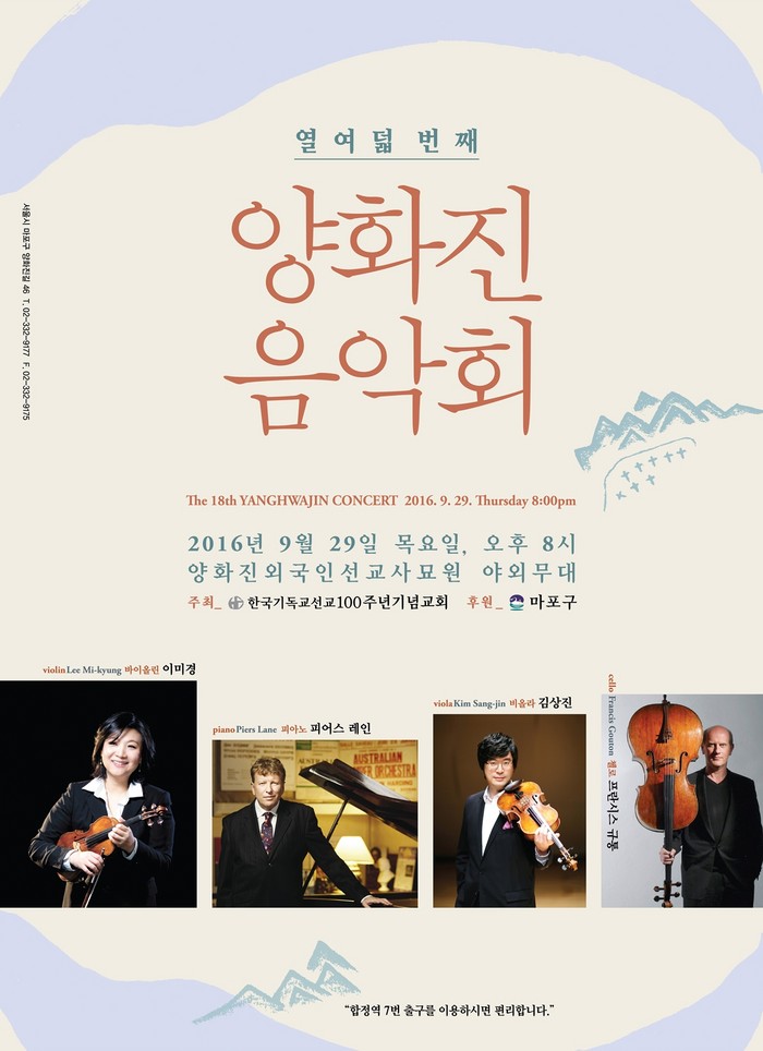 이번 음악회는 한국기독교선교100주년기념교회가 주최하고 마포구가 후원하며 국내외 정상급 연주자 4명이 각각 피아노, 바이올린, 비올라, 첼로 등으로 환상적인 연주를 펼쳐 관객들을 매료시킬 예정이다.