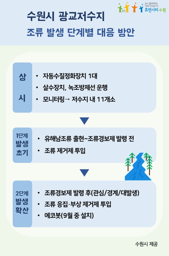 19~21일 조류제거제를 투입해 저수지 표면에 대량으로 발생한 유해 남조류를 제거했다. 광교저수지는 현재 조류 발생 이전의 수질 상태를 유지하고 있다.