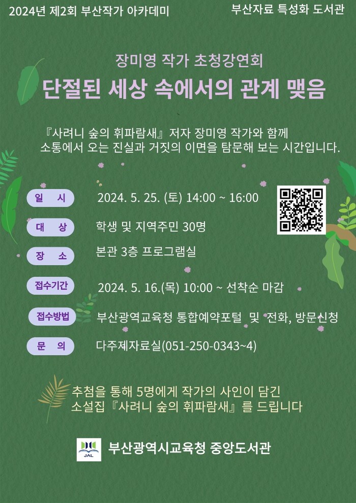 [로컬세계 부산=전상후 기자] 부산시립중앙도서관은 오는 25일 오후 2시부터 지역주민 30명을 대상으로 중앙도서관 프로그램실에서 ‘제2회 부산작가 아카데미 – 단절된 세상 속에서의 관계 맺음’프로그램을 운영한다고 14일 밝혔다.