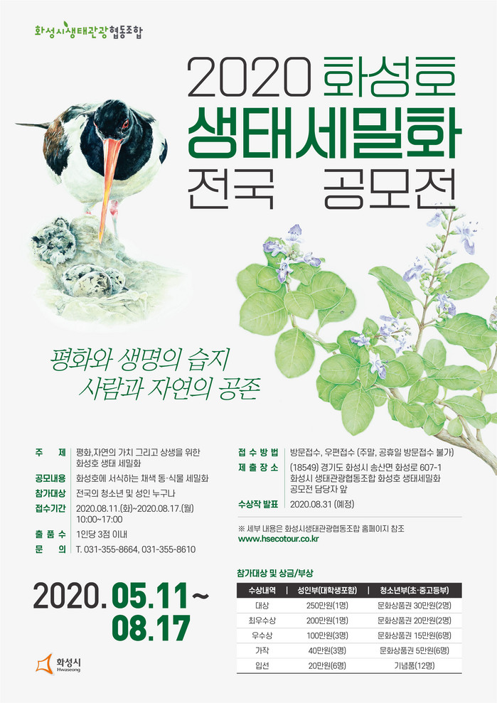 공모전 참여를 희망하는 지원자는 화성호 자생 동·식물을 4절지(성인) 또는 8절지(청소년)에 담아, 오는 11일부터 8월 17일까지 화성시생태관광협동조합으로 우편 또는 방문 접수하면 된다.