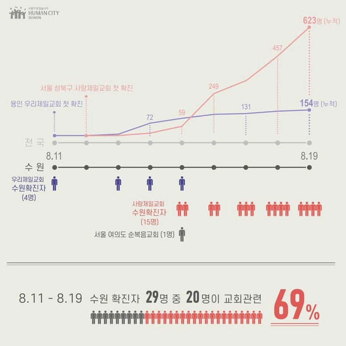 지난 11일부터 19일까지 수원시에 코로나19 확진자 29명이 발생했는데, 그중 20명(69%)이 교회 관련 확진자다.