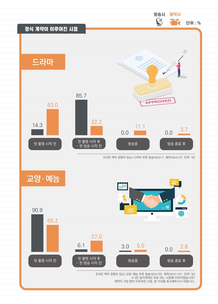 반면 제작사의 표준계약서 활용비율은 전년 대비 2.1%p 감소한 89.8%로 나타났으며, 표준계약서 사용에 대한 방송사와 제작사 간 인식차도 확인할 수 있었다. 전체 외주제작 계약 중 표준계약서 또는 이에 준하는 계약서를 통한 계약이 ▲방송사 답변 기준 평균 98.5% ▲제작사 답변 기준 평균 89.8% 수준으로 약 8.7%p 차이를 보였으며, 전년(6.4%p) 대비 그 차이가 증가했다.