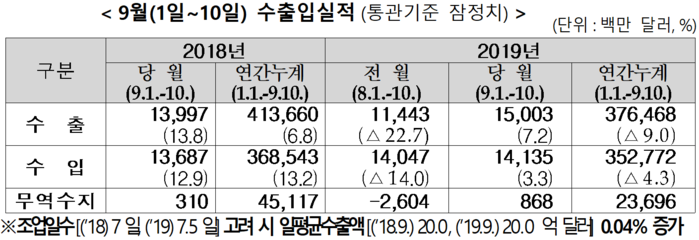 수출은 작년 같은 기간 대비 무선통신기기(105.6%), 승용차(20.7%), 가전제품(50.5%) 등은 증가했으며, 반도체(-33.3%), 석유제품(-3.7%), 액정디바이스(-56.1%) 등은 줄었다.